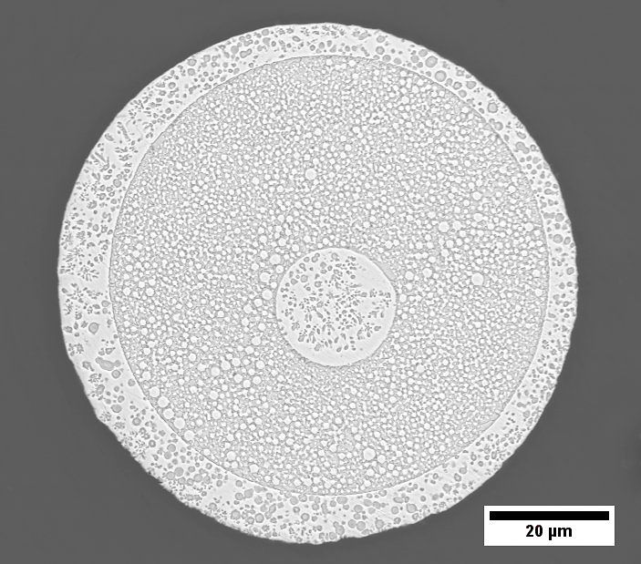 Figure 1 below from OE, Jegede et. al 2023, shows a typical fully evolved core-shell microstructure in the Cu-Co alloy, it has distinct polydisperse Cu-rich particles in a Co-rich core region. Within the core of the larger dispersed Cu - rich, evidence of secondary liquid phase separation is observed with the formation of dendrites within its core.